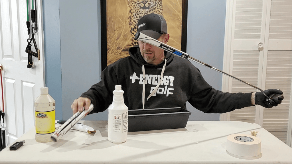 - Pour your grip tape solution onto your new putter grip holding it over your mud pan while plugging the hole on the bottom of your grip with your finger.